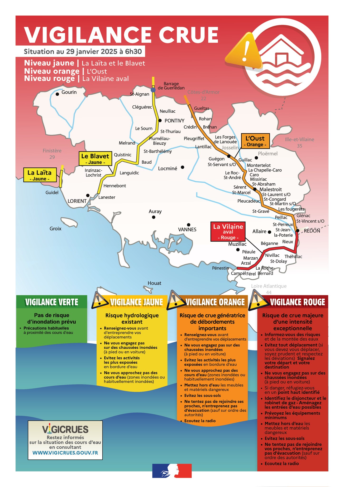 La préfecture vous informe que le département du Morbihan est placé en état de vigilance météorologique de niveau rouge pour risque de crues.