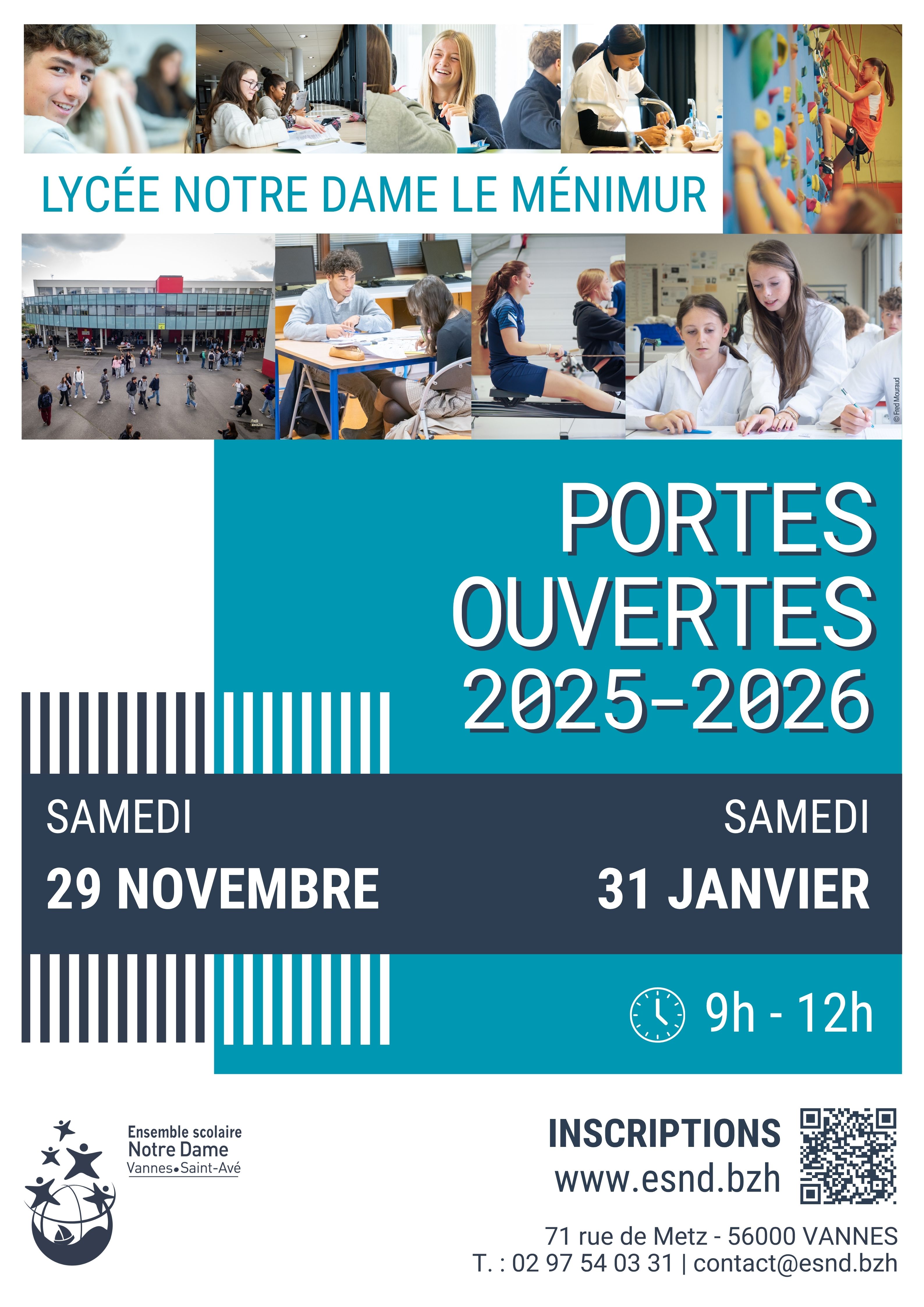 Éducation Portes ouvertes du lycée Notre Dame le Ménimur Accueil Agenda Portes ouvertes du lycée Notre Dame le Ménimur Portes ouvertes du lycée Notre Dame le Ménimur le 31 janvier de 9 h à 12 h. 31 janv. Portes ouvertesSamedi 31 janvier de 9 h à 12 hSur inscriptionsLycée Notre Dame le Ménimur, 71 rue de Metz 71 rue de Metz Evit monet pelloc'h geti Éducation 16 janv. 17 janv. Salon Info’sup Bretagne Sud Le salon de l’Enseignement supérieur du Morbihan Éducation 24 janv. Portes ouvertes du collège Notre Dame le Ménimur Portes ouvertes du collège Notre Dame le Ménimur le samedi 24 janvier de 9 h 30 à 12 h. Infos pratiques 71 rue de Metz Voir sur la carte Événement gratuit Événement accessible 02 97 54 03 31 contact@esnd.bzh Notre Dame le Ménimur