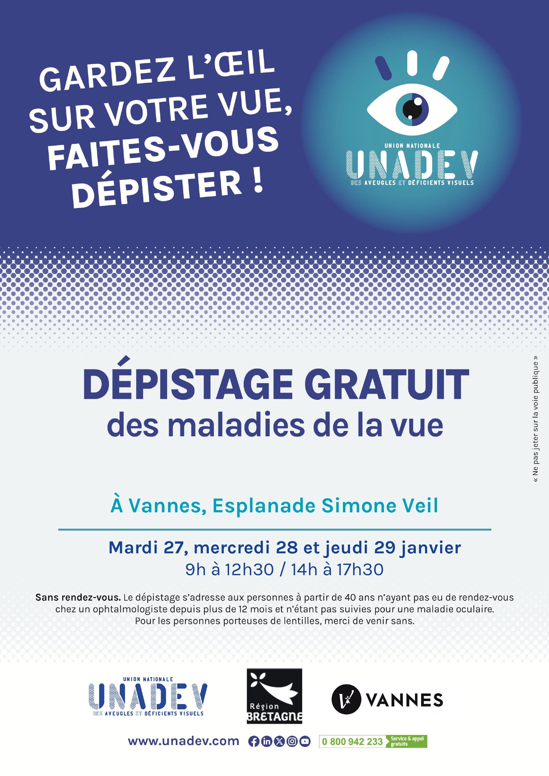 L’Union Nationale des Aveugles et Déficients Visuels (Unadev) mènera une campagne de prévention du 27 au 29 janvier, avec la présence du Bus de l’Unadev, une semi-remorque équipée d’un cabinet d’ophtalmologie et d’un espace accueil.