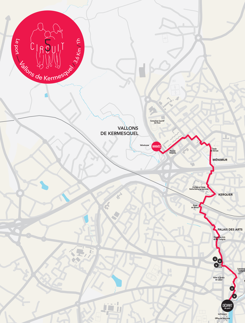 Dirigez-vous vers la place Gambetta, remontez vers la place des Lices, empruntez la rue pavée des Halles, traversez la place Henri IV pour rejoindre l'hôtel de ville, puis le palais des arts. Continuez sur votre gauche en direction de l'école de Rohan, afin de rejoindre le nord de Vannes et les Vallons de Kermesquel, véritable poumon vert vannetais !