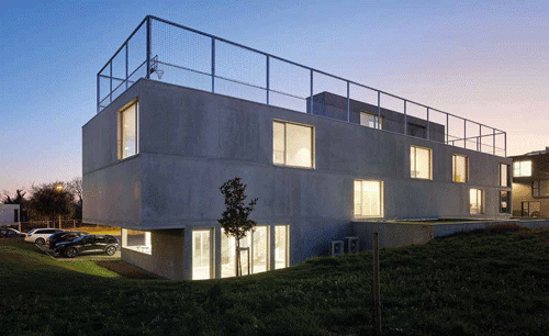 Les 8 places de stationnement en rez-de-chaussée sont recouvertes d’une toiture végétalisée. L’aménagement paysager d’ensemble contribue à la réussite architecturale de cette réalisation