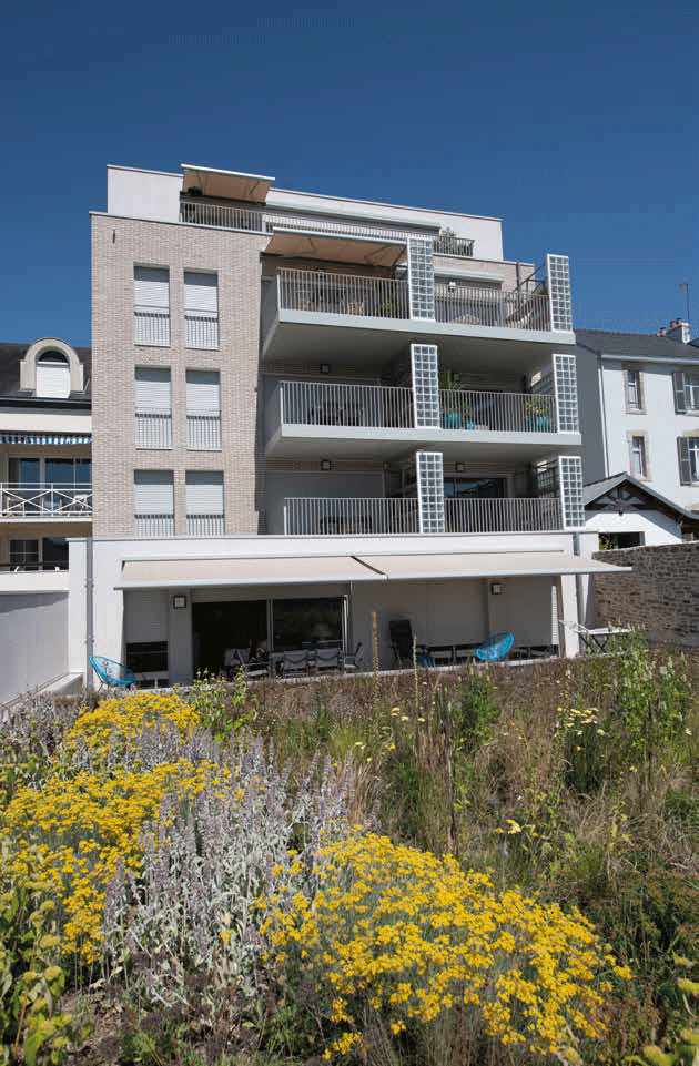 Rue Monseigneur Tréhiou, cet immeuble de 8 logements construit sur une parcelle de 451 m2 surplombe le port en remplacement d’un petit bâtiment déconstruit. Cette résidence de gabarit