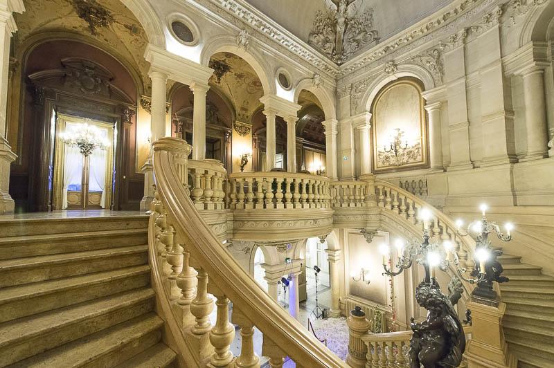 Le corps central est percé de cinq arcades en plein cintre devant un escalier imposant qui donne accès à une salle des pas perdus agrémentée de colonnes et d’un remarquable escalier symétrique, en marbre jaune. A l’extérieur, ce dernier est mis en valeur par le large fronton sculpté encadrant l’horloge, surmonté d’un campanile.