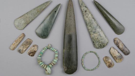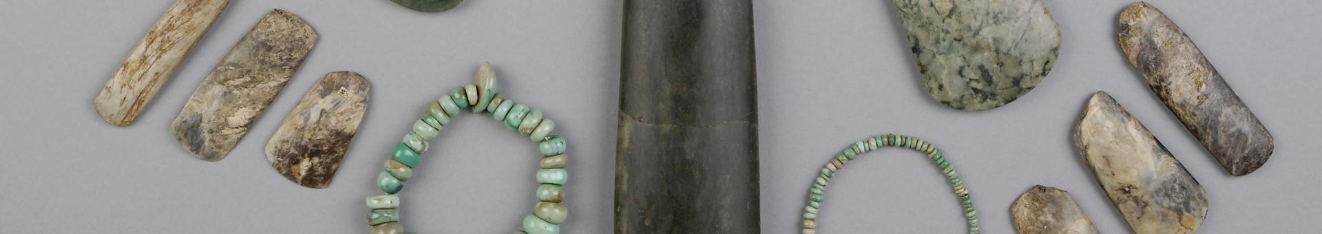 L’ensemble le plus remarquable et quasi unique en France est l’exceptionnel mobilier funéraire du Néolithique, daté de 4500 ans avant notre ère, provenant de grands monuments mégalithiques du littoral morbihannais : tumulus Saint-Michel et du Moustoir en Carnac, Mané-er-Hroeck en Locmariaquer et Tumiac en Arzon. Ce mobilier comprend plusieurs centaines de haches polies des parures en roches rares (jadéite, variscite…) et diverses poteries.